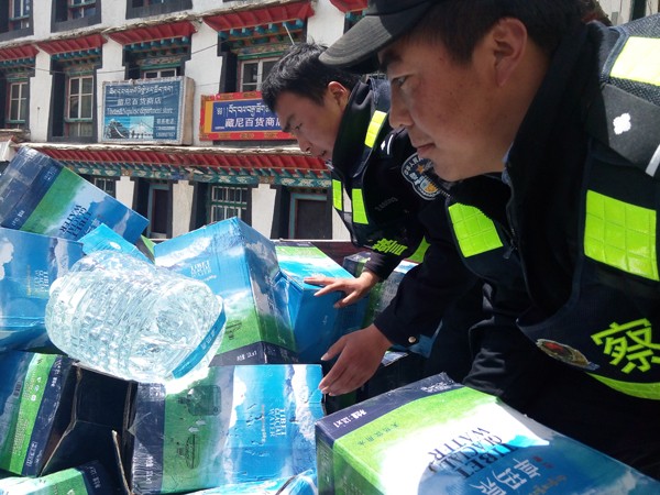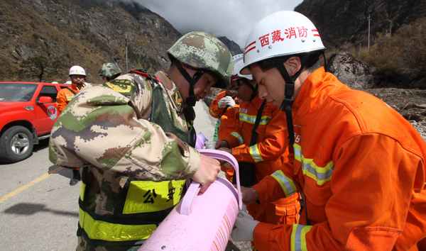 图为聂拉木通往樟木口岸的曲乡边防检查站的武警战士在热情地为前往救援的消防战士服务。记者 次旺 摄