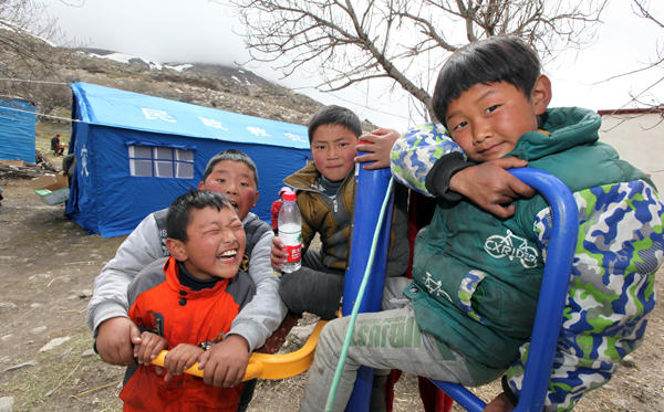 图为在日喀则市聂拉木县安置点救灾帐篷外玩耍的孩子们。记者 次旺 摄