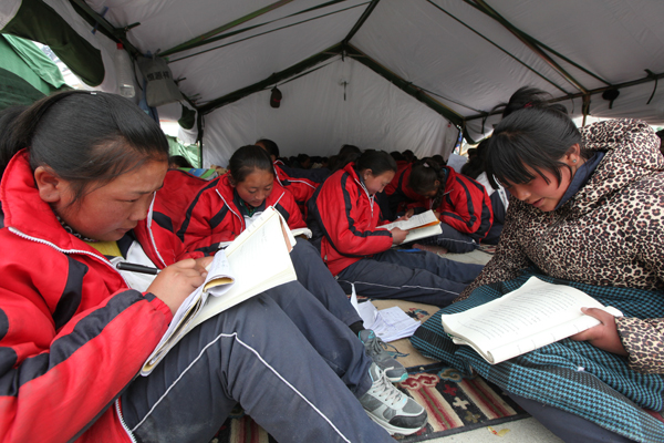 图为聂拉木县中学临近中考的学生在救灾帐篷里安静地复习功课。记者 次旺 摄