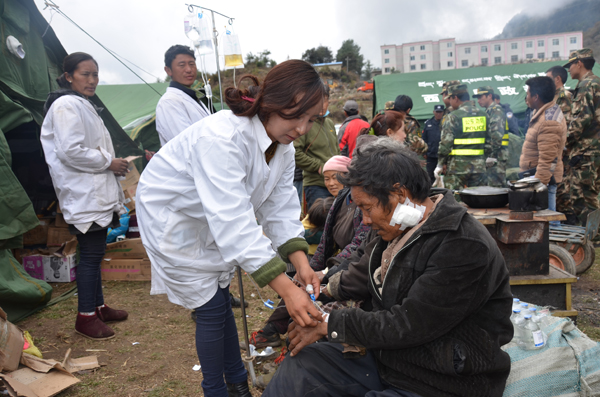 目前,吉隆地震受伤人员均得到妥善治疗。图为吉隆县萨勒乡群众正在接受治疗。记者 王杰 摄