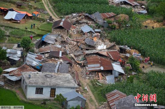 当地时间2015年4月29日,尼泊尔Dhadingbesti,从直升机上可以看到,高海拔地区的房屋在此次地震中完全被毁。