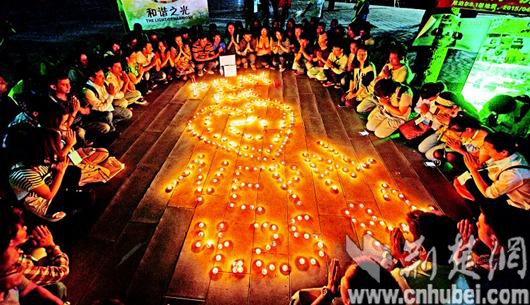 4月29日晚8时,武汉大学新图书馆附近一角,有人点起蜡烛。心形图案的烛光在夜幕中闪耀,小提琴的哀婉乐声在夜空中回荡。29岁的拉姆站在人群中,双目微闭,双手合十,自尼泊尔发生大地震以来,他一直在为万里之外的家乡亲人祈福。