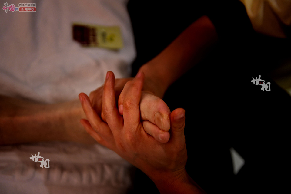 刘丽为前来足浴的老人按摩脚,常年的按摩让她的手上布满老茧。