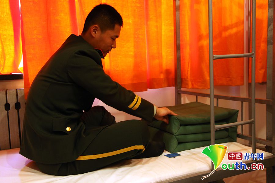 战士正在整理自己的床铺。中国青年网记者 隗功臣 摄