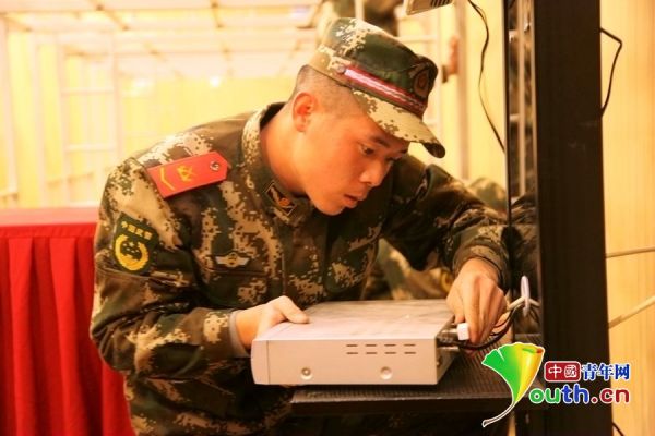 武警战士正在调整室内电视线路。 中国青年网记者 隗功臣摄