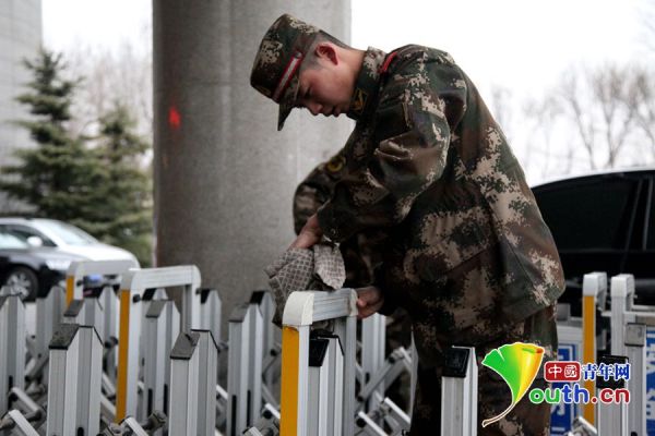 战士们正在擦拭梅地亚中心外的围挡。 中国青年网记者 隗功臣摄