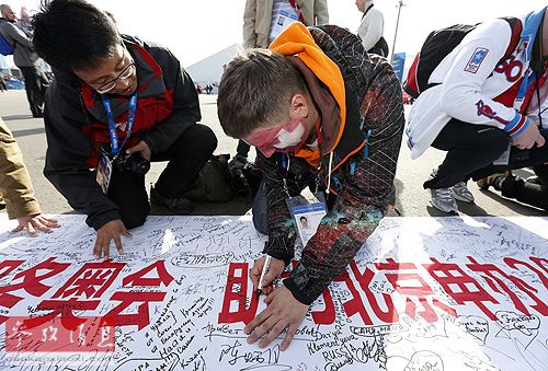 资料图片:由服务2014索契冬奥会的中国志愿者组织发起的“志愿服务索契冬奥会 助力北京申办2022年冬奥会”签名活动在索契奥林匹克公园举行。新华社记者王丽莉摄