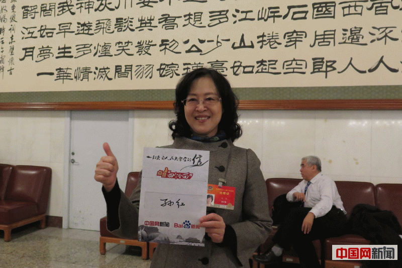 面对实现伟大复兴中国梦征途中的一系列问题,习近平总书记总结中国经验、针对中国难题,提出“四个全面”战略布局。在2015年全国两会上,“四个全面”成为主旋律贯穿会场上下、话题内外。在中国网发起的“来自人民大会堂的一封信”活动中,全国人大代表、政协委员纷纷为“四个全面”战略点赞。中国网将把代表、委员的签名信从全国两会现场邮寄给祖国各地的网友,让广大网友与人大代表、政协委员共同点赞“四个全面”!图为全国政协委员、沈阳市政协副主席孙红为“四个全面”战略点赞。动态图片由中国网记者陈维松、魏婧、宋一安及魏方超拍摄