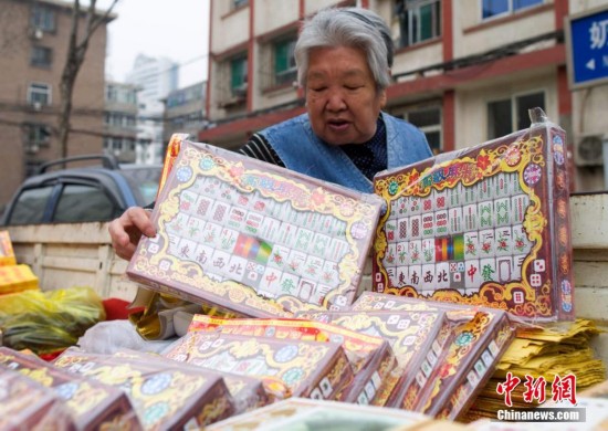 3月31日,山西太原民众在翻看“麻将”祭品。随着清明节将至,各种祭奠用品也悄然在山西太原街头登场,除了鲜花、纸钱、金元宝等传统祭奠用品外,中华香烟、三五香烟、麻将等祭品也出现。中新社发 张云 摄