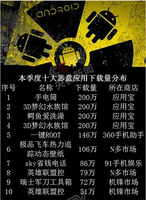 (二)早在2013年,央视就曝光了十大安卓手机恶意软件,它们可能随时定位用户位置,甚至窃取所有密码,产生不必要的资费消耗。这些恶意软件有的下载量已经高达200万次。更让人难以接受的是,这些恶意软件多是从知名应用商店下载而来,有些商店恶意软件的下载次数甚至接近1000万次。所以,当我们下载了一些不确定是否安全的软件时,最好将该软件读取通话、删除/写入联系人、读取位置信息等泄露隐私有没有必要的权限进行禁止。