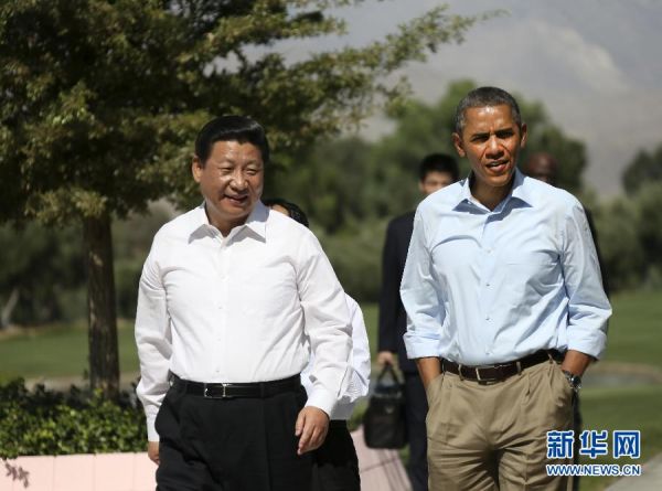 资料图:2014年6月8日上午,中国国家主席习近平同美国总统奥巴马在美国加利福尼亚州安纳伯格庄园举行第二场会晤。会晤开始前,习近平和奥巴马在风光秀丽的庄园内散步,在轻松的气氛中交谈。(新华社记者 兰红光 摄)