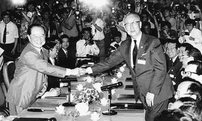 1993年4月27日上午10时,汪道涵先生(左)和辜振甫先生越过会议桌,紧紧握手。(资料图)