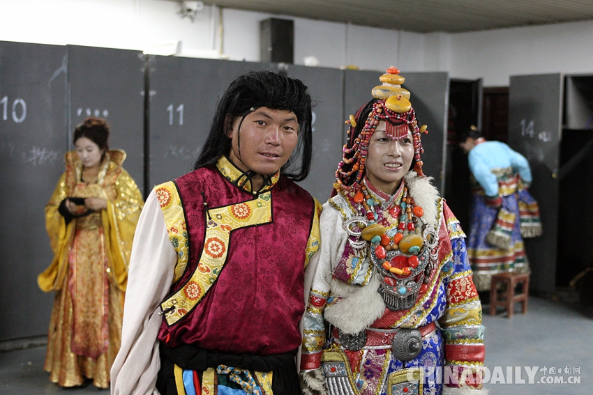 洛旦(左)和巴桑曲珍(右)夫妻俩都是《文成公主》实景剧的演员,洛旦今年25岁,是剧中的舞蹈演员;巴桑曲珍今年28岁,在剧中饰演三少女。他们13年3月在实景剧演员选拔中相识,现在已经有了一个一岁的孩子。自从转行演员以来,洛旦一个月能挣3000多,巴桑曲珍也能挣2000多,相比之前提高不少。洛旦还在学习驾驶,打算以后白天开车拉货,晚上参加演出,用自己的辛勤让家人生活的更好一些。(摄影/王壮飞) |