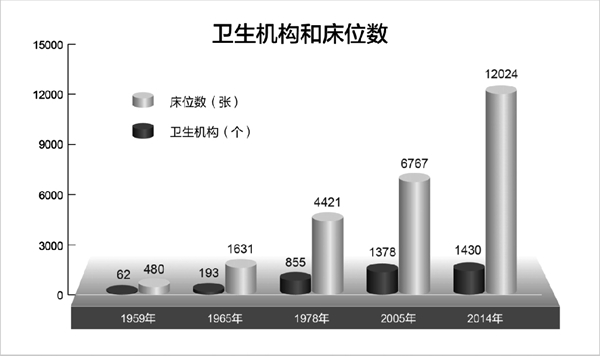 医疗卫生事业快速发展。目前,西藏已经建成了中、西、藏医结合,以拉萨为中心、遍布城乡的医疗卫生网。以免费医疗为基础的农牧区医疗制度覆盖全体农牧民,全区已建成71个县医院和678个乡镇卫生院,覆盖城乡的医疗卫生服务体系逐步完善。2014年底,全区医疗卫生机构发展到1430所,每千人病床数和卫生技术人员数分别达到3.79张和4.08人,建成了覆盖县乡村三级的医疗卫生网络。城镇职工、城镇居民基本医疗保险年度最高支付限额分别提高到30万元、20万元。城镇居民基本医疗保险财政补助标准提高到年人均380元,政策范围内住院费用支付比例达到75%左右。农牧民人口100%被纳入到以免费医疗为基础的医疗保障体系之中,农牧区医疗政府补助标准达到年人均420元,最高报销补偿限额达6万元,政策范围内报销补偿比例达到80%以上。寺庙僧尼等人群全部纳入基本医疗保险范围。取消了医疗救助起付线,率先在全国实现了医疗救助城乡一体化和社会全覆盖。对城乡居民实施免费健康检查,城乡居民健康档案建档率达99%。2013年,孕产妇死亡率和婴儿死亡率分别下降到154.51/10万人和19.97‰。人均寿命由20世纪50年代的35.5岁增加到68.17岁。全区实现了基本消除碘缺乏病目标。