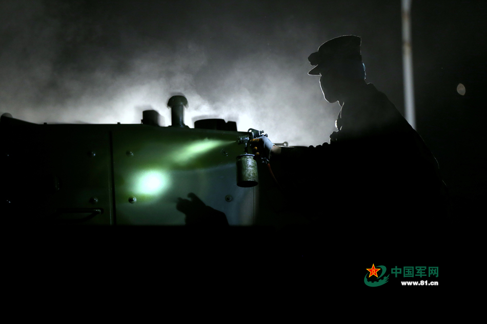 1:00,一名战士正在为战车涂装。为了保障备战阅兵活动,该方队官兵吃住在车场,连续奋战3天3夜,完成了原计划8天的涂装工作量。