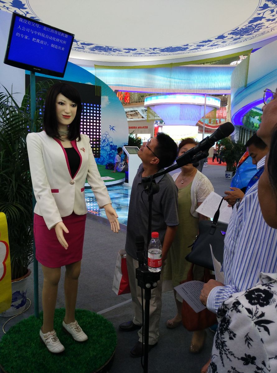 在中博会南昌馆,一位长发披肩、着白色上衣和红色短裙职业套装的“美女”微笑着与参观者进行互动,走近一看,这位有着身高1.70米的“美女”竟是一位仿真人机器人。