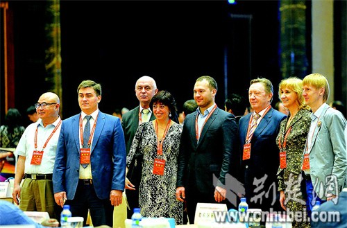 图为:昨日,第九届中部投资贸易博览会暨主旨论坛在武汉国际博览中心隆重开幕。图为参会外宾在开幕式现场拍照留念。(记者倪娜 摄)