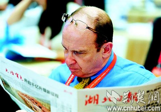 图为:昨日,中博会现场,外宾在认真阅读当天的《湖北日报》。 (记者 杨平 摄)