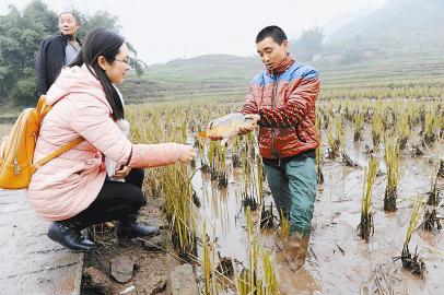 宜宾市江安县怡乐镇青龙村贫困户李高建(右)展示稻田养鱼的成果。 本报记者 何海洋 摄
