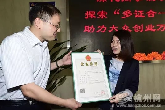 3月29日,大学生创业者余超拿到了杭州地区首张“1+X”多证合一营业执照,“27号申请办理的,今天就拿到了营业执照,非常快,就跑了一次。”
