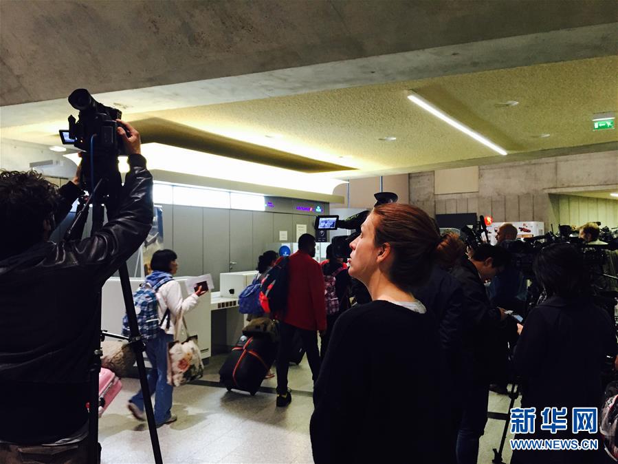 5月19日,在法国巴黎,媒体在戴高乐机场的埃及航空公司柜台前拍摄采访(手机拍摄)。当日,埃及航空公司由法国巴黎飞往埃及开罗的MS804航班坠海。埃航称,这架航班客机型号为空客A320,载有59名乘客和10名机组人员。新华社记者郑斌摄