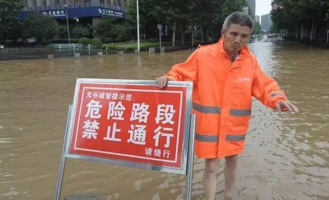 在光谷大道金融港三路路口,没过小腿肚的渍水里,头发花白的李德灿守着警示牌,提醒车辆慎入,提醒行人绕道。李德灿穿着一双解放鞋,掀起橘色制服一看,卷到大腿的裤子全湿了。他的脚面上很多水泡溃口,露着粉红的皮肤,“这都是之前穿胶鞋打脚磨的。”