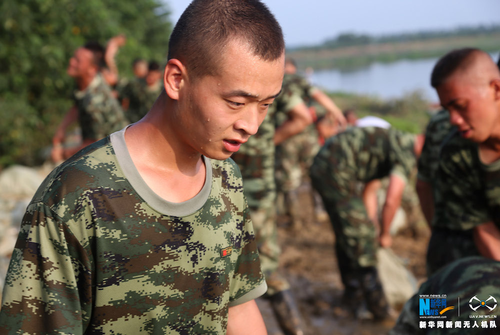 由于连续的强降雨,湖北省汉川市距城区60公里的垌塚镇老灌湖水位急剧上升,发生漫堤险情,危及垌塚镇16个村2万余村民和近三万亩农田。7月7日上午7时许,武警孝感市支队200名官兵紧急驰援,装填、转运沙袋,垒筑沙包加高加固大堤。由于天气炎热,周围道路狭窄,鱼塘和水田密布,给救灾带来一定难度。目前抢险扔在紧张进行中。图为7月7日,汉川市老灌湖,抢险的武警战士汗流浃背。新华网发 张益民摄