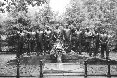 在中共五大会址纪念馆大门前,立有首届中央监察委员会10位委员的雕像 记者彭年 摄