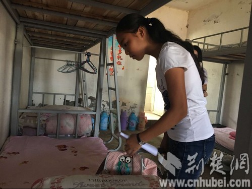 张冰妍正在整理自己的寝室 荆楚网记者 郑青摄
