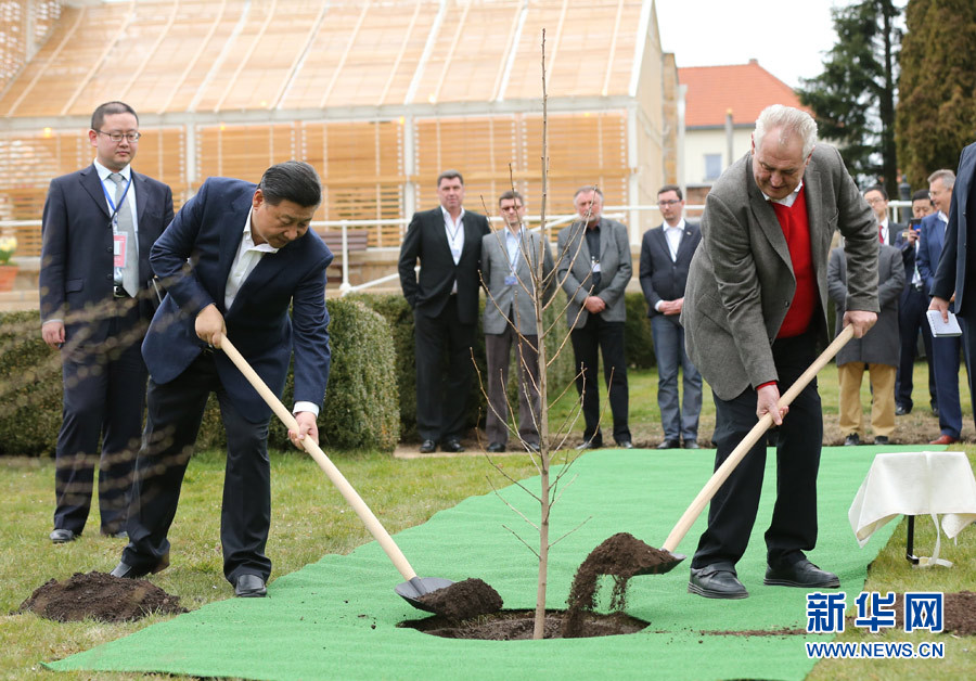 当地时间3月28日,国家主席习近平在布拉格拉尼庄园同捷克总统泽曼举行会晤。会晤前,两国元首在庄园里种下一株来自中国的银杏树苗。新华社记者 兰红光 摄