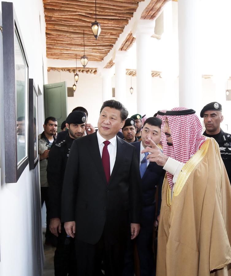 1月20日,国家主席习近平在沙特阿拉伯国王萨勒曼陪同下参观“四方宫”。 新华社记者 鞠鹏 摄