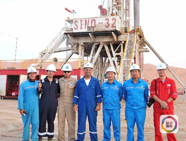 2015年8月14日,中石化中原油田员工与沙特阿美石油公司员工在沙特东部一油田钻井平台前合影。(新华社记者王波摄)