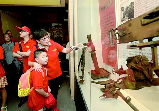 图为:一位参观者向孩子介绍当年革命时战士使用的武器。