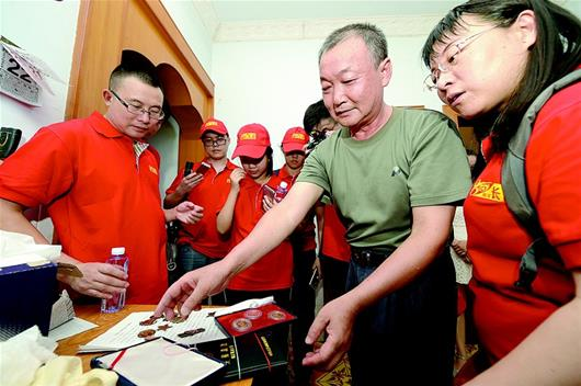 图为:老红军高庆云的后人向前来寻访慰问的青年展示父亲获得的纪念章。