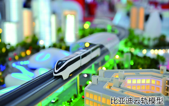 蚌埠展区展示的云轨令市民眼前一亮。云轨,是指在城市道路中间的绿化带上搭起深至二三十米、高至12米的双向轨道,列车在其上运行,最高时速可达80km/h,如同半空飞过。主要特点是爬坡能力强,转弯半径小。据介绍,2017年1月4日,蚌埠市与比亚迪集团签署了战略合作协议,项目建成后,蚌埠将成为比亚迪云轨在安徽的制造中心。