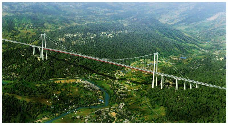 这座世界上最长的跨居住区三跨连续钢桁梁悬索桥是贵州六盘水市大董公路项目的重要组成部分,是大董公路最关键性的控制性工程。