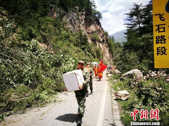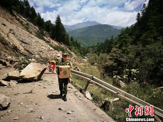 图为武警水电部队官兵为九寨沟被困的游客运送食物。 武警水电部队供图 摄
