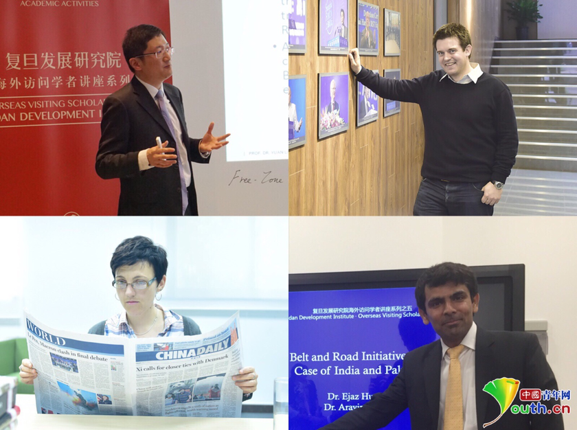 左上:德国杜伊斯堡-埃森大学教授李远,右上:匈牙利学者胡庆建,左下:英国青年学者凯瑟琳?欧文,右下:巴基斯坦青年学者埃贾兹?胡赛因。复旦发展研究院供图