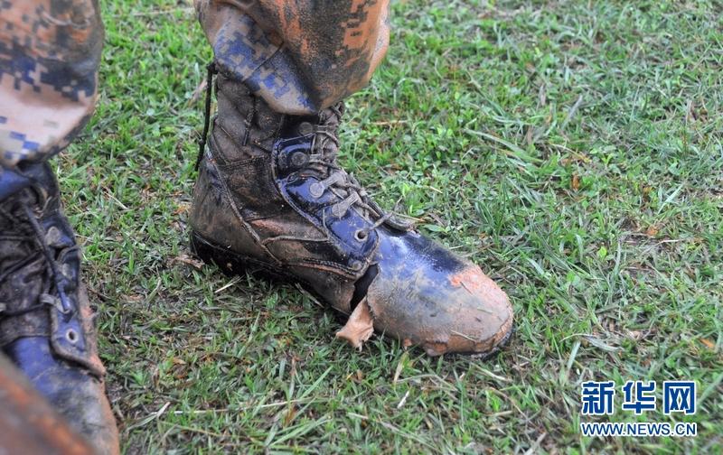 7月20日,记者走进驻扎粤西的海军陆战队某旅,近距离观摩了障碍训练、轻武器射击、步兵战车战术训练等科目的精彩训练。图为训练中,战士的靴子被刮破。新华网记者 黄河摄