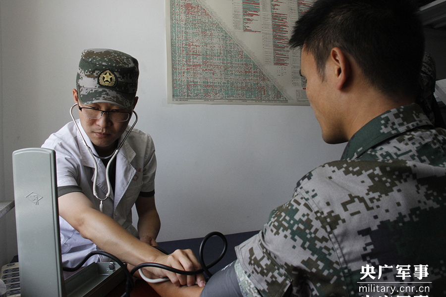 连队军医张军正在给同行记者测量血压。李晓波摄