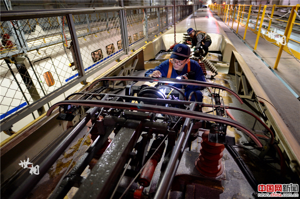 1号地勤机械师正对动车车顶高压设备检修保养。