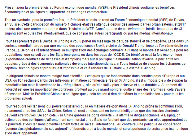 近来,英国脱欧、特朗普赢得美国大选、法国极右势力也不断上升。在民粹主义崛起的全球背景下,习近平主席在演讲中倡导和平、稳定和共同繁荣。他认为,不同国家之间加强贸易往来是有利于人民的,无论是发展中国家的人民,还是经合组织成员国的人民。这不仅仅体现在经济方面更多的财富与就业机会的输出,更体现在政治方面,全球化使不同的国家相互依存,这有利于世界人民的团结。习近平主席表示:“想人为切断各国经济的资金流、技术流、产品流、产业流、人员流,让世界经济的大海退回到一个一个孤立的小湖泊、小河流,是不可能的,也是不符合历史潮流的。”