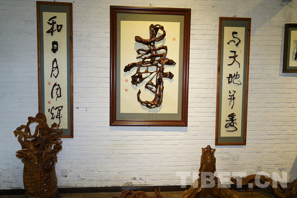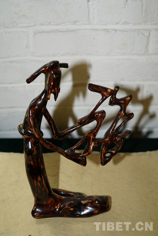 中国西藏网讯 根书,多半取材自高山杜鹃根创作而成,既有传统根艺的艺术精华,也有传统书法的神韵美感,更有立体艺术效果。一套成熟的根书作品,需要经过选材、拼版、烘干、去皮、抛光、打磨、着色上漆等38道工序,用艺术的手法拼接成独具特色的书法艺术作品。图为根书作品《鹿》。