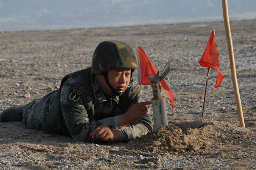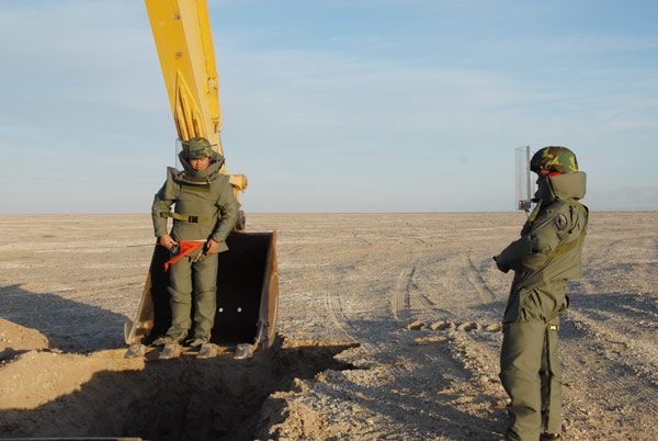 2004年5月的一天,盛德华执行某项哑弹排除任务。在戈壁大漠50多度的地表温度下,他穿着12公斤重的防弹背心,戴着密不透风的防弹头盔,驾驶防爆挖掘机展开排弹操作,经过3个小时令人窒息的挖掘,终于完成了任务。后怕的是,一枚哑弹几乎贴着铲斗右侧内壁,如果铲斗偏离10厘米,很有可能触发引爆,导致车毁人亡。