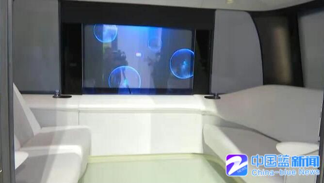 正中间是一块显示屏,两边是座椅,这辆造型美观的智能车叫“未来座驾”,车内是一个影音体验区。同时,我们可以发现,这辆车没有任何的驾驶舱。