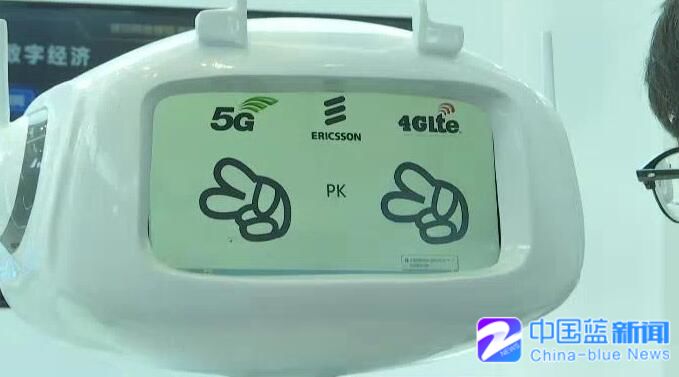 这有一台5G人机互动机,可以跟他玩石头剪子布。首先,我们可以看到屏幕左边的是使用5G的技术,右边这个是使用4G的技术,记者出石头,屏幕上显示出了两个“布”。