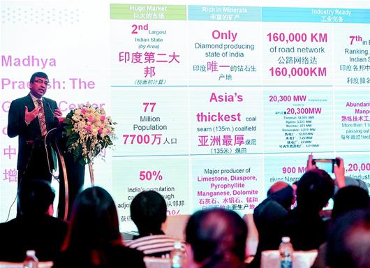 图为:印度中央邦贸易投资促进公司总经理波瓦介绍印度中央邦投资机遇。