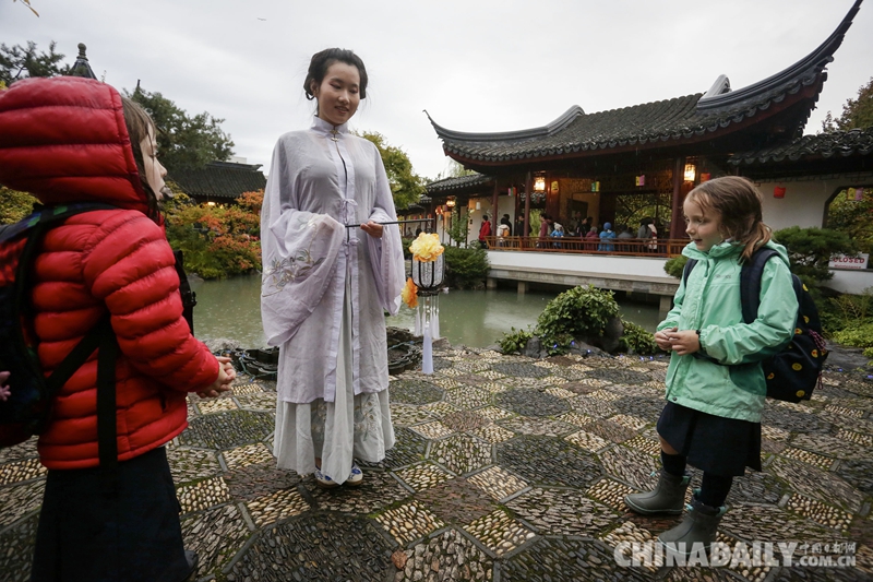 9月21日,在加拿大温哥华,一名穿着汉服的女子引起了孩子们的好奇。 当日,温哥华唐人街的中山公园举办中秋节晚会,让当地民众感受中国传统节庆文化的欢乐气氛。