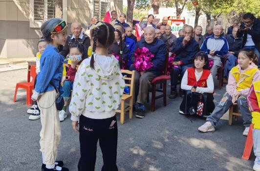 10月23日,孝昌县花园镇晏河幼儿园组织学生来到健乐老年公寓,与老人们一起欢庆重阳。