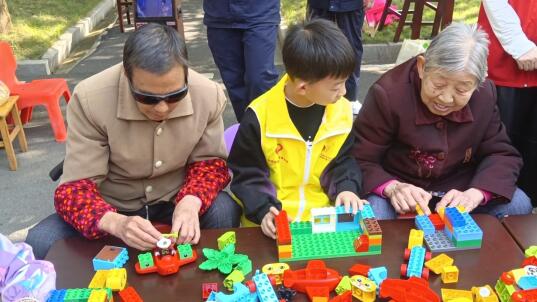 表演过后,孩子们自发地来到爷爷奶奶身边一起搭积木、玩数字游戏,志愿者与老人们聊天送上慰问品,现场老幼同乐场面温馨。